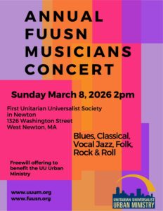 Come and hear the wonderful musicians of the First Unitarian Universalist Society in concert on Sunday, March 8, 2025 at 2pm in the FUUSN Sanctuary. This concert is a fundraiser for the UU Urban Ministry. You’ll hear classical chamber music by pianists Paul Antonucci and Lois Shapiro, along with guitarists Bob MacWilliams and Chris Welles. Of course the intrepid FUUSN Band will be there, rocking the house. Enjoy the fantastic array of musical styles and moods: a cappella singing, classical works, bluegrass tunes, jazz and more. And we’ll continue our tradition of Cookies at Intermission!