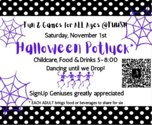 - Saturday, November 1, 2025: 5 – 8pm Halloween Fun and Games Night Potluck Dinner and dancing- please bring food and/or drink for 6 people. Sign up here for food and to volunteer.