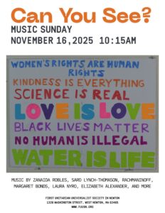This service presents music about transformation and change, both personal, healing transformation and being a force for change in the world. There will be a wide variety of songs, including The Times They Are A-Changin’, Hejira, Swing Down, Chariot, and a gorgeous setting of James Weldon Johnson’s Sonnet (My heart be brave). The FUUSN Choir will be joined by the Band, CreationDance, Bob MacWilliams, and Lois Shapiro. Directed by Anne Watson Born.