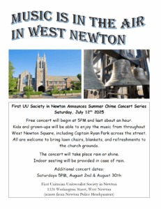 Free outdoor tower chime concert, rain or shine. Bring your family, lawn chairs, blankets, and refreshments to enjoy the music outdoors. In case of rain, seating in the Narthex will be provided.